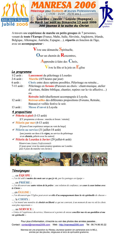 Le site de Manresa 2006 Inventaire des suggestions pour Lourdes Ce qui se prépare dans les régions Comment être informé gratuitement ? Qui sont Ignace, François-Xavier et Pierre ?